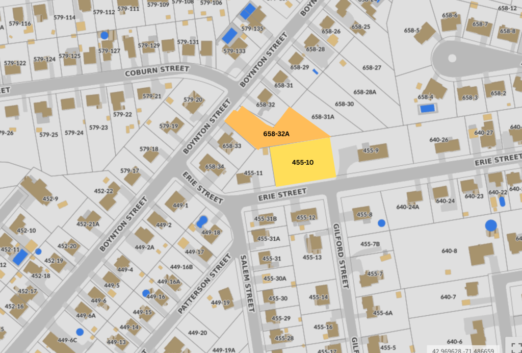 Above: Property located on Erie Street (Tax Map 455, Lot 10) and Boynton Street (Tax Map 658, Lot32A), a subdivision application for a lot line adjustment between the two above-noted lots where parcel A of 7,467 s.f. is subtracted from Tax Map 455 Lot 10 and added to Tax Map 658 Lot 32A, and Parcel B of 5,278 s.f. is subtracted from Tax Map 658 Lot 32A and added to Tax Map 455 Lot 10, leaving Tax Map 455 Lot 10 with 17,439 s.f. and Tax Map 658 Lot 32A with 12,769 s.f., in an R1-B Zoning District.