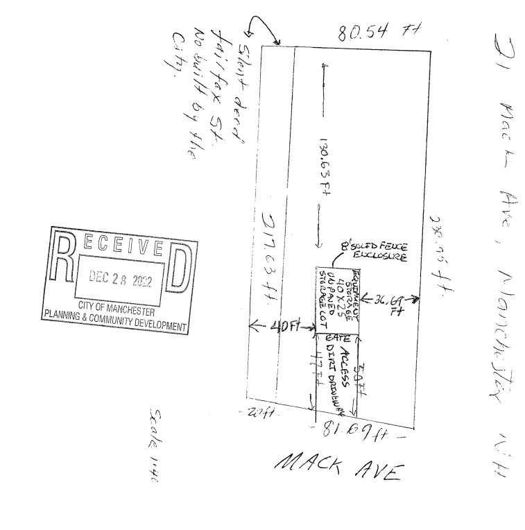 Applicant proposes to establish a building contractorโ€™s yard with an 8โ€™ solid fence enclosing a 25โ€™ x 40โ€™ storage area for equipment, on a lot with frontage and width of 101โ€™ where 150โ€™ is required, without pavement for the driveway, without the required on-site maneuvering area requiring backing out into a public way, and without the required 50โ€™ limited activity buffer from adjacent residential lots and seeks a variance from sections 5.10(C)2 Building Contractorโ€™s Yards, 6.02 Lot Frontage and Width (2 counts), 10.07(E) Parking Paving, 10.07(D) Parking Maneuvering, 10.02(F) Business Parking in a Residential District and 6.08(B)7 Screening Buffers.