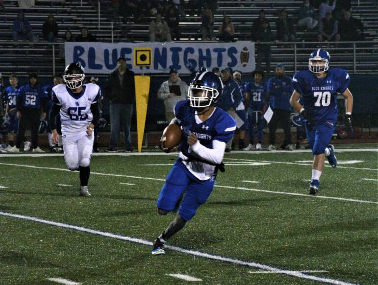 Hollis-Brookline added another touchdown on their second drive of the evening, this time with McQuilkin finding freshman J.C. Cora through the air on a five-yard strike, but after that moment the momentum began to swing back toward the Blue Knights.