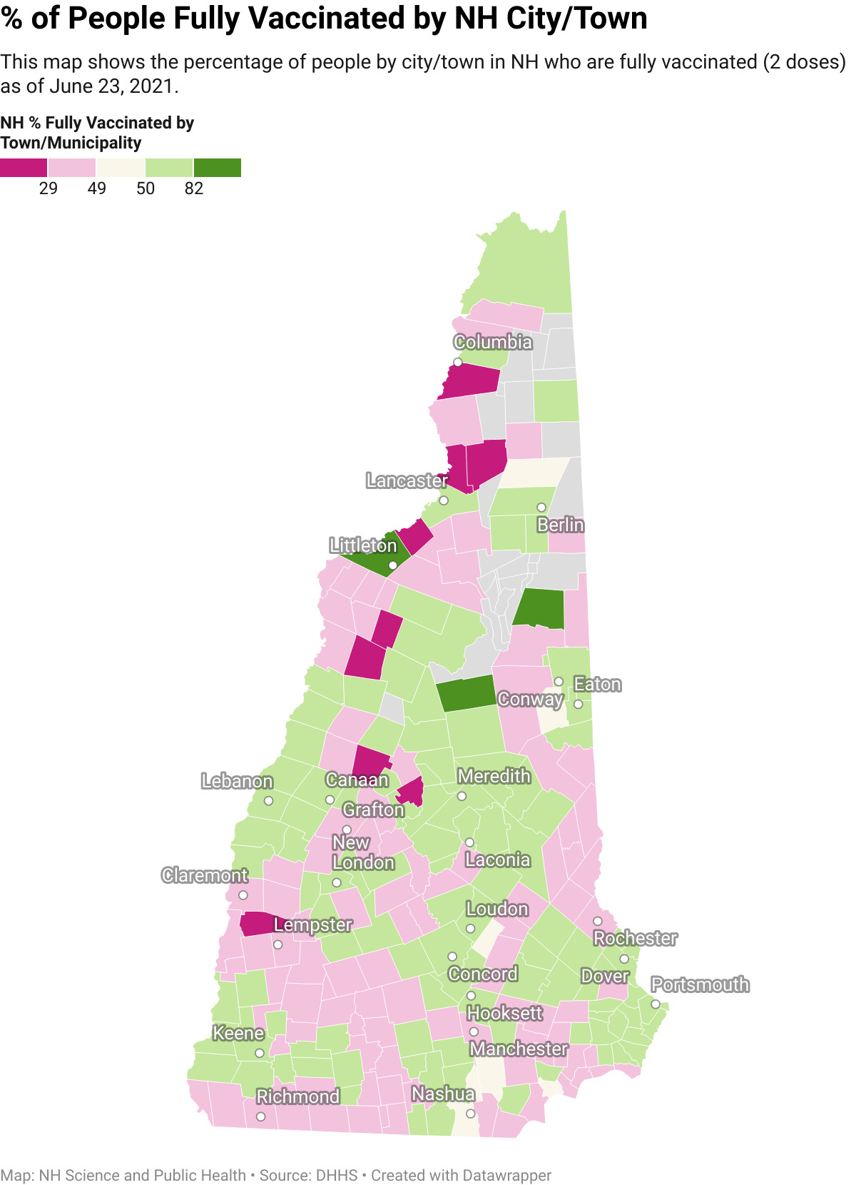 This information has limitations, according to DHHS spokesman Jake Leon. For example, Durham’s vaccination rate of 29 percent could be inaccurate if University of New Hampshire students listed their home address rather than their school address when they got the shot.