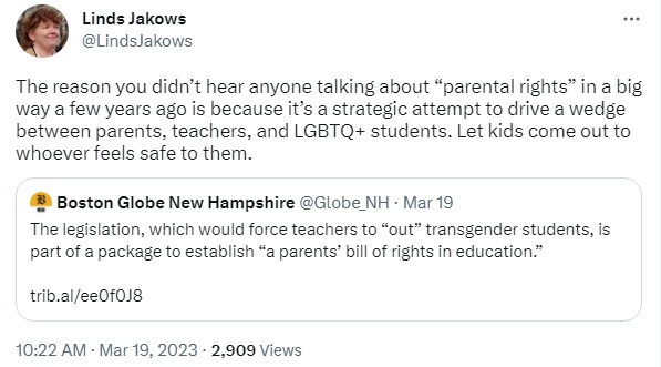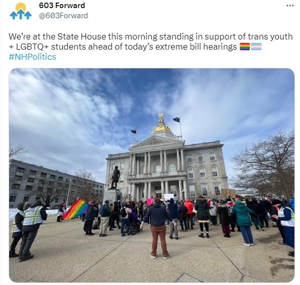 Linds Jakows from 603 Equality has been tracking anti-LGBTQ legislation, both locally and at the state level in New Hampshire for some time. They organized around a situation in Milford where the local school board contemplated a bathroom ban.ย