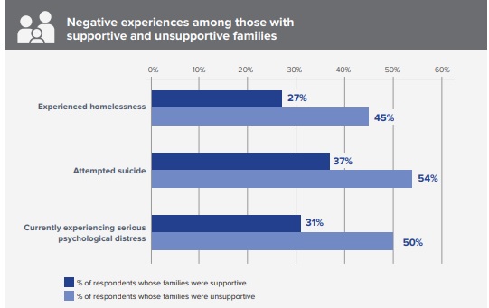 Eighteen percent of respondents claimed their family was โunsupportive.โ Those who had supportive families were โless likely to report a variety of negative experiences related to economic stability and health, such as experiencing homelessness, attempting suicide, or experiencing serious psychological distress.โ