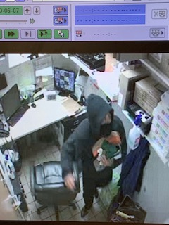 Video surveillance captured an unknown male entering the building. He is seen going directly to the area of the restaurant where money is kept, grabs cash, and leaves through the rear door. The entire burglary takes about two minutes.