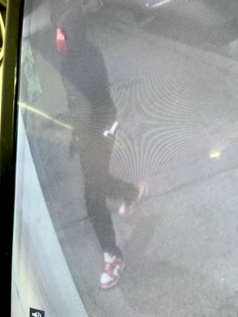 The suspect was wearing black pants and a hooded sweatshirt, red-and-white Nike sneakers, a red maskย covering half her face, ending just below her eyes, and black gloves with skull hands on top.The suspectย also appears to have a tattoo on her wrist.ย