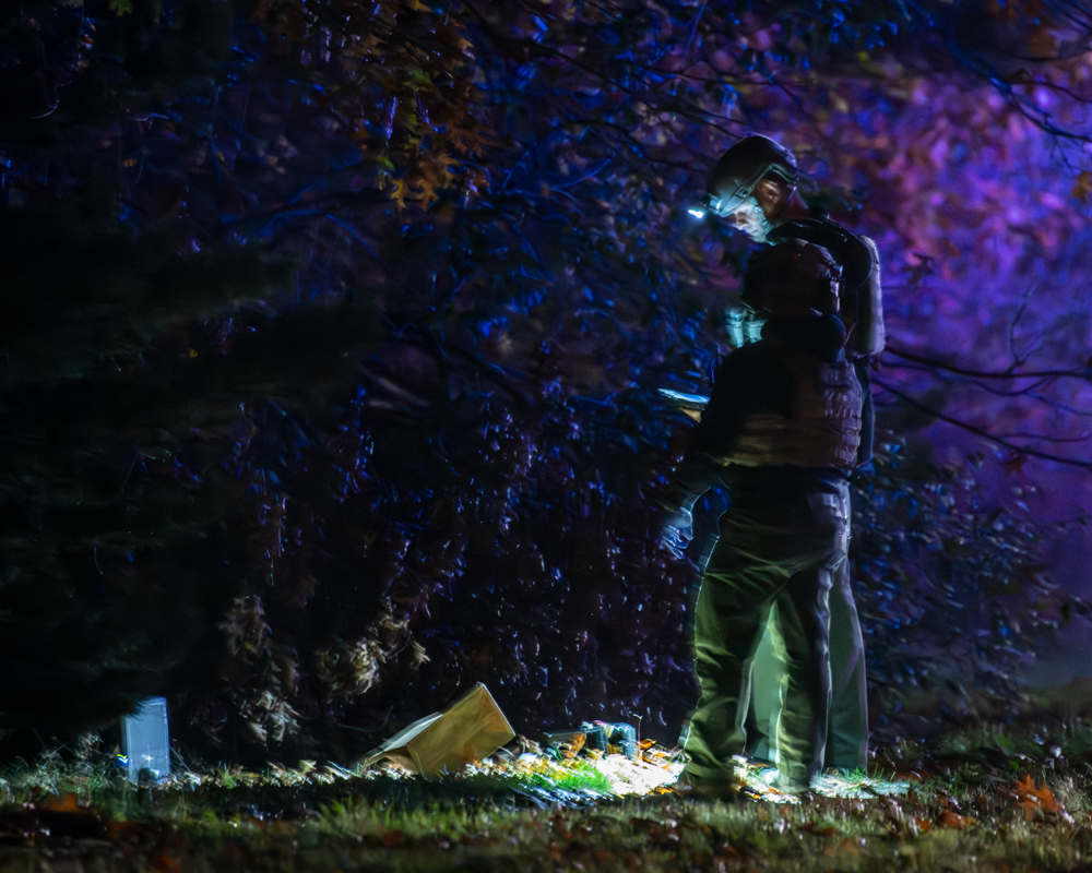 State bomb squad personnel investigate an area around Exit 6 on Nov. 5, 2023. Photo/Jeffrey Hastings