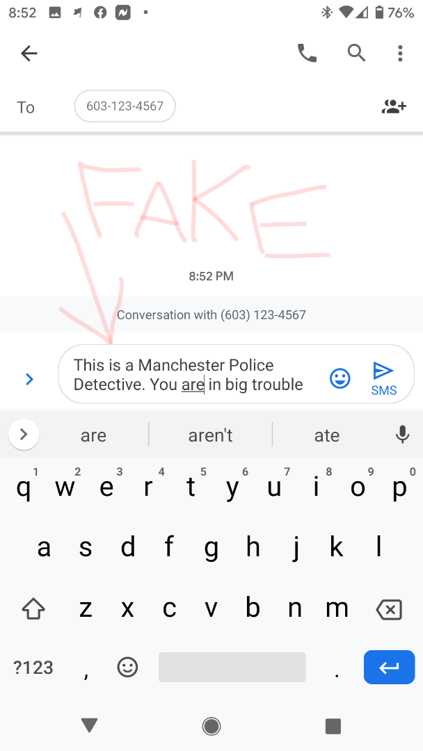 Shortly after the victim said that he received a text message from someone purporting to be a Manchester Police Detective who said they investigate sexual crimes. The victim was informed that a complaint had been filed against him and he needed to call police. The victim did not return any calls, but rather reported the incident to police.