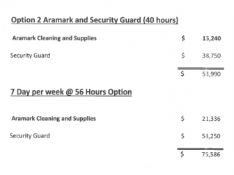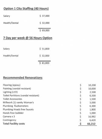 Below is a slideshow of the current bathroom conditions as presented to the committee in December, along with an estimate for: $105K for a full-time attendant and supplies; $45K for Aramark cleaning and a security guard; $52K for renovations and security cameras.