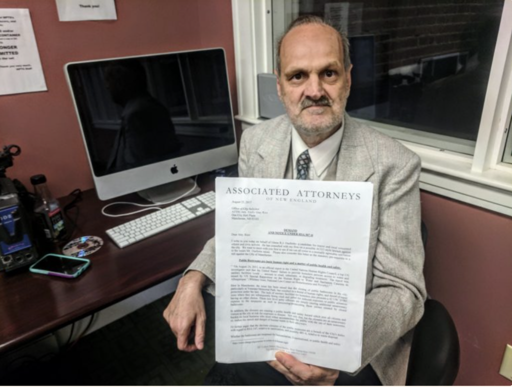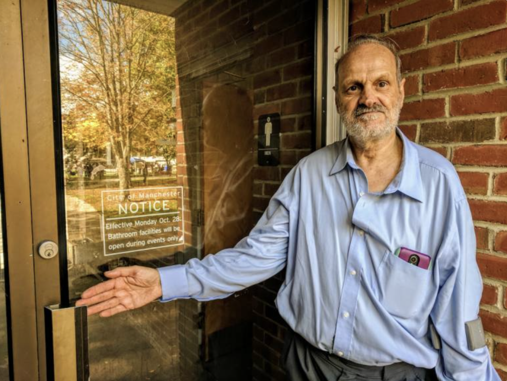 MANCHESTER, NH – After more than three years of badgering the city to open public bathrooms at the downtown Visitor’s Center – even filing a lawsuit against the city citing human rights violations – this one-man potty patrol’s persistence may be paying off.