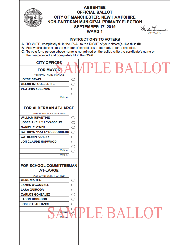 If you are a member of the military you can obtain from your commanding officer a Standard Form 76 (red and white form), Federal Post Card Application – Registration and Absentee Ballot Request. If you are an overseas citizen or if your commanding officer does not have the form you can print out the online version of the Federal Post Card Application and mail it to the City Clerk’s Office, One City Hall Plaza, Manchester, NH 03101.