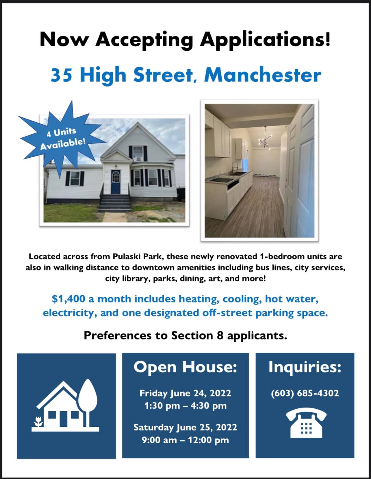 St. Pierre Interests is currently accepting applications for the 35 High Street property for any and all Section 8 voucher recipients not currently in stable housing. For more information call 603-685-4302.