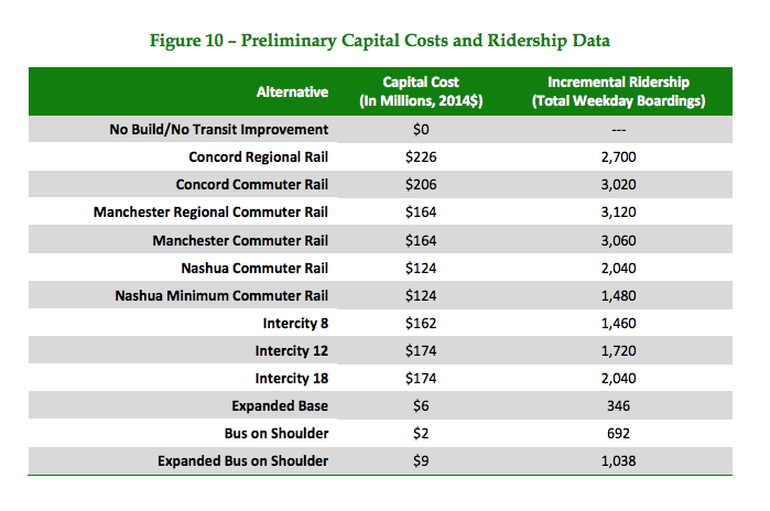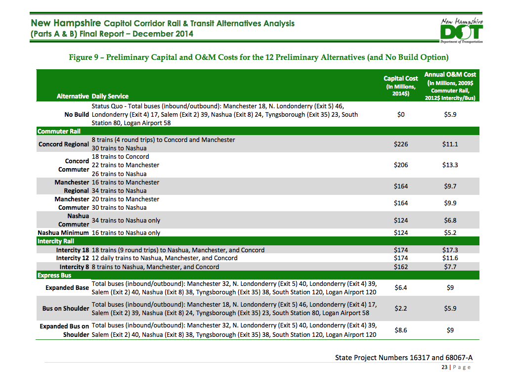 Summary of the five recommended strategies – No Build, Manchester Regional Community line, Nashua Minimum rail line, Intercity 8 and Bus on Shoulder.Preliminary Capital and O&M Costs for 12 preliminary alternatives.Preliminary costs and ridership data.