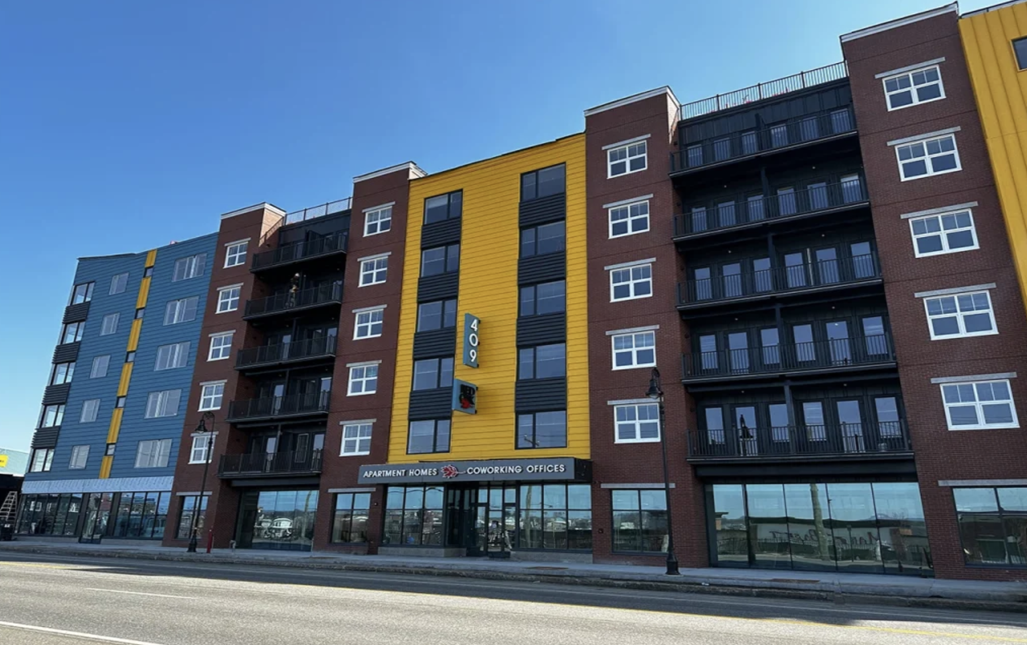 The modern color-block six-story structure at 409 Elm Street – its name is its address – features 90 “apartment homes” that range in price from $1,899 for “The Pluto,” a 431-square-foot studio, up to $2,999 for “The Jupiter,” a 2-bed/2-bath 914-square-foot top floor corner unit facing Elm Street with a seemingly-endless view.