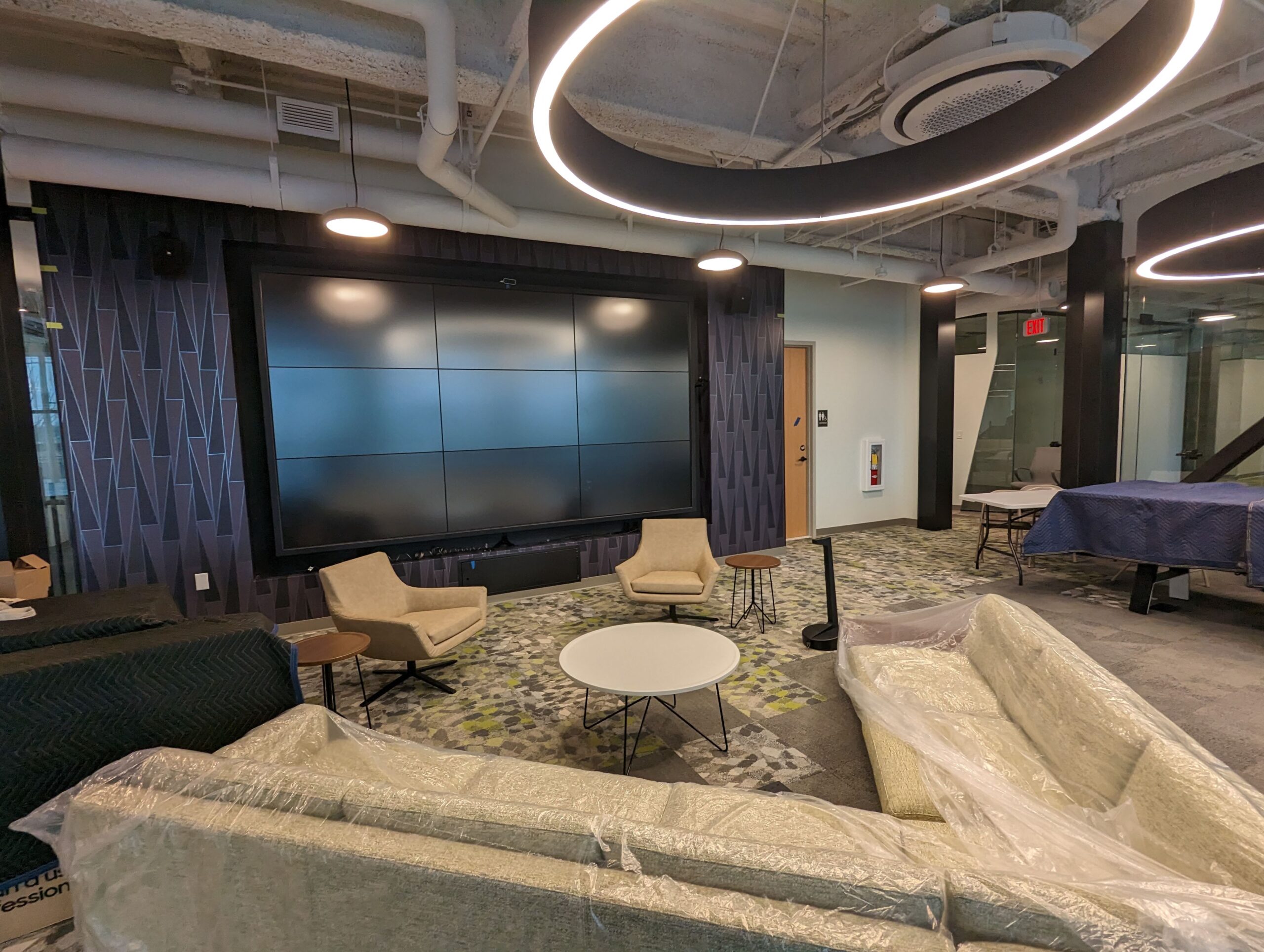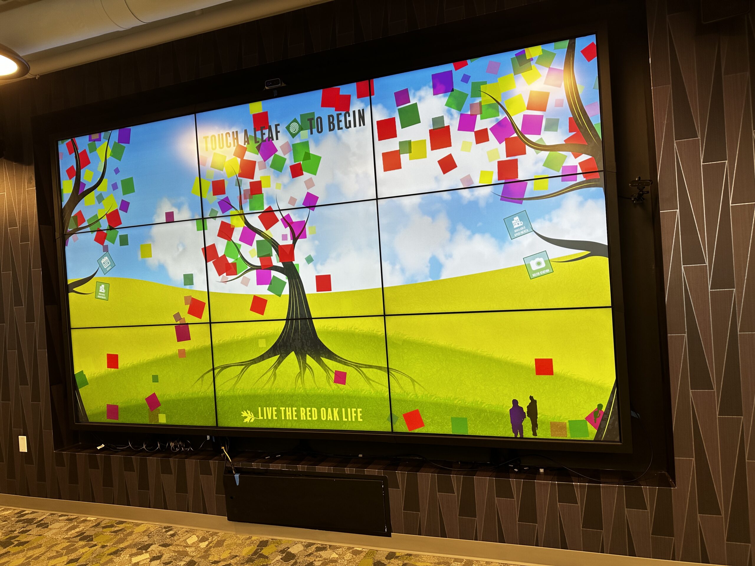 She is particularly excited about the lobby and its centerpiece – a huge interactive array of screens which can detect a person’s presence and then provide information accordingly. Want to know the weather? Looking for local events happening this week? Interested in a virtual tour of available apartments? It’s all just a touch-screen away. There is a coffee/snack bar just beyond the lobby.