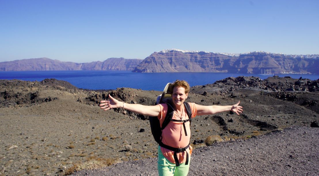 It was about 83 degrees the end of September so, hard to imagine the heat in the dead of summer, the barren black lava “moonscape” emitting a fiery heat as hot as Hades. But, goodness gracious, what spectacular view. The city-scapes of Oia and Fira in the distance as if floating on on a cloud. I twirled like a crazed ballerina, my arms extended to the sky in ecstatic abandonment. Some guy from Germany asked if I wanted him to take my picture. Heck, yeah, for prosperity.