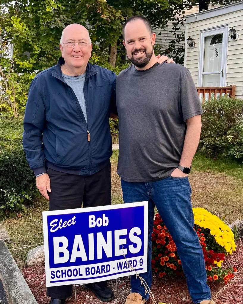 Bob Baines when he was running for School Board a couple years ago, at left, posing with friend of Day By Day, Ben Dion.