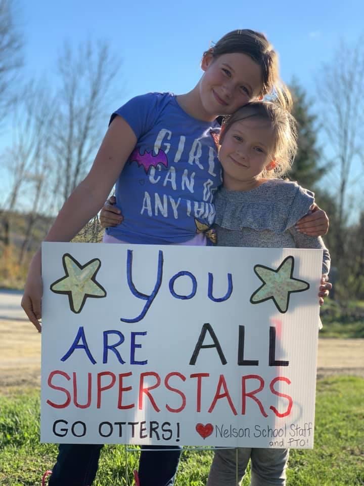 “You can temporarily close our doors, COVID-19, but you can’t kill our spirit! At Nelson School, our staff created handmade signs for all of the families to remind them that we miss them, care about them, and believe in them!” (May 24 Facebook Post, photo and caption, SAU 29)