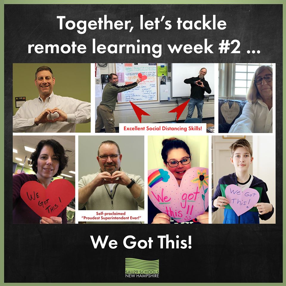 “When you’re in a situation that is not the norm, and it’s completely devastating to families, to homes, to individuals, we have to make sure that the family priorities are taking precedence,” said Robb Malay, superintendent of SAU 29. “Our business is education and in our world that is the priority.” But, he said, educators need to accept that academics, in the midst of a societal crisis, take a backseat.(SAU 29 Facebook Post March 29.)