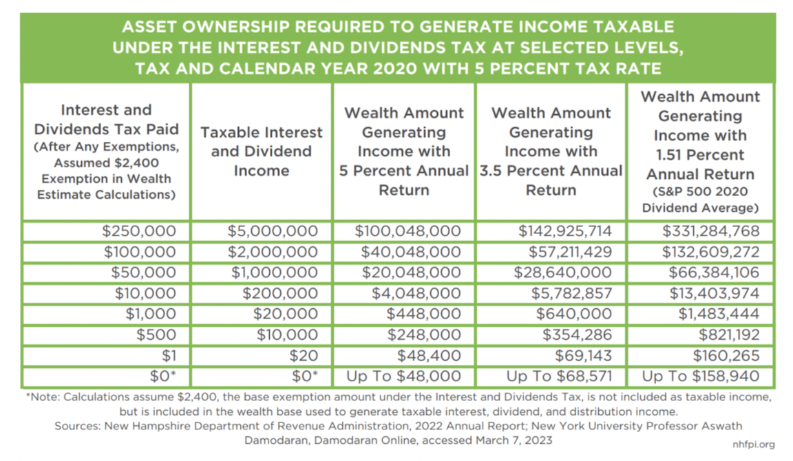 The New Hampshire Department of Revenue Administration data indicates that, for tax year 2020, more than half of the Interest and Dividends Tax revenue was paid by Granite State households with more than $200,000 in interest, dividend, and distribution income, which excludes income from wages, salaries, capital gains, or other income sources.