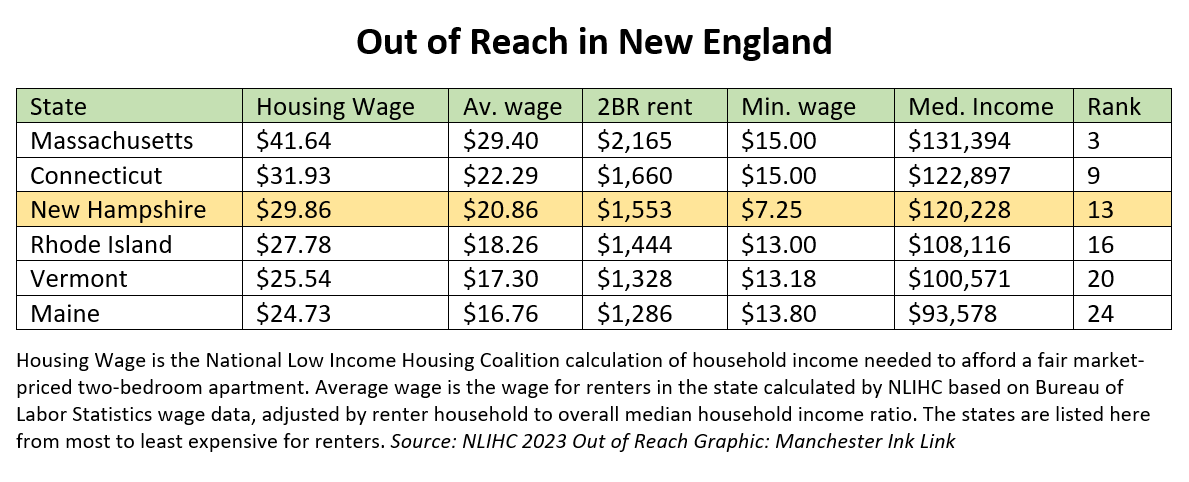 The coalitionโs annual Out of Reach Report, which analyzes what people must earn to afford rental housing in the U.S., ranks New Hampshire the 13th most expensive state for renters, with a $29.86 hourly wage needed to afford a two-bedroom apartment at $1,553 a month [the stateโs average fair market rental rate for that size apartment]. That means an annual salary of $62,109, when the stateโs renters, who make up 28% of New Hampshire households, make an average of $42,848.