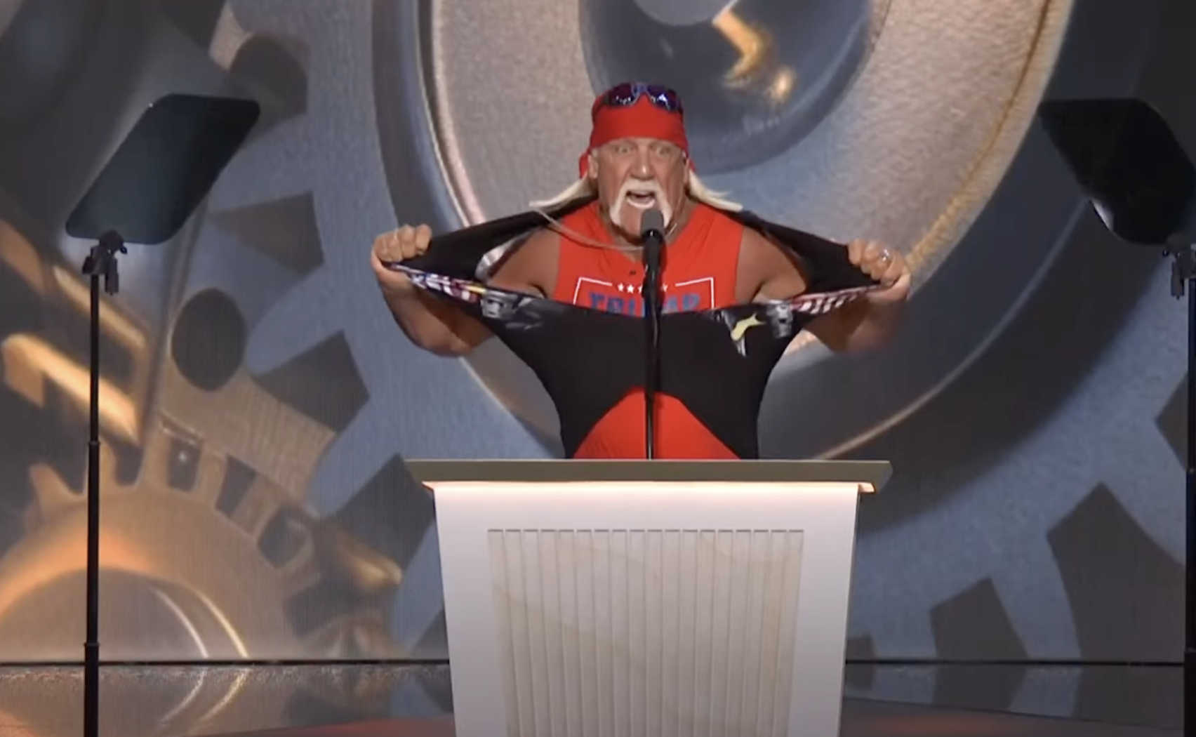 At one point I thought I saw the Hulk Hogan of my youth—the WWF “say-your-prayers and eat-your-vitamins” Hulk Hogan—standing at a podium in front of a room full of Suits, ripping off his T-shirt while screaming that Donald Trump was his “hero” and “a real American.”