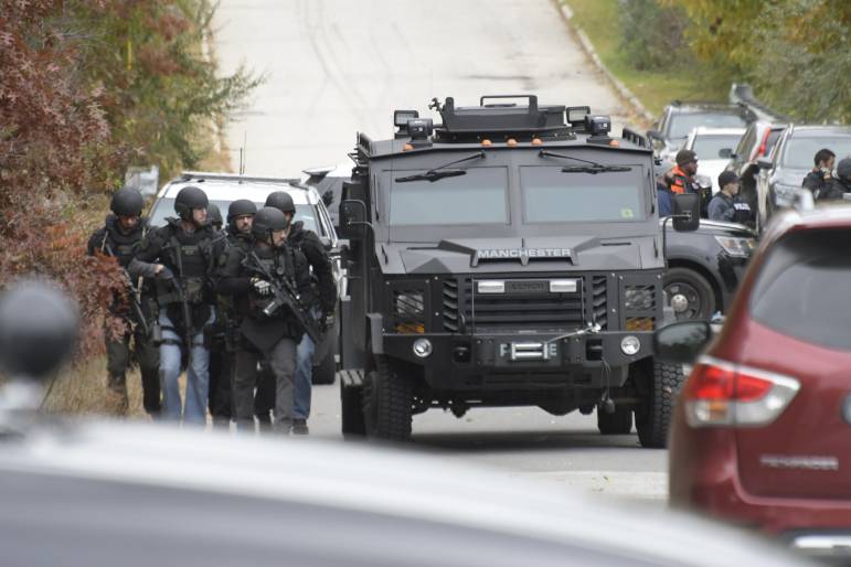 Members of the Manchester Police SWAT team evacuated at least one nearby residence and have asked additional residents in the immediate neighborhood to shelter in place until the incident is resolved, and school buses have been detoured to an alternative location.