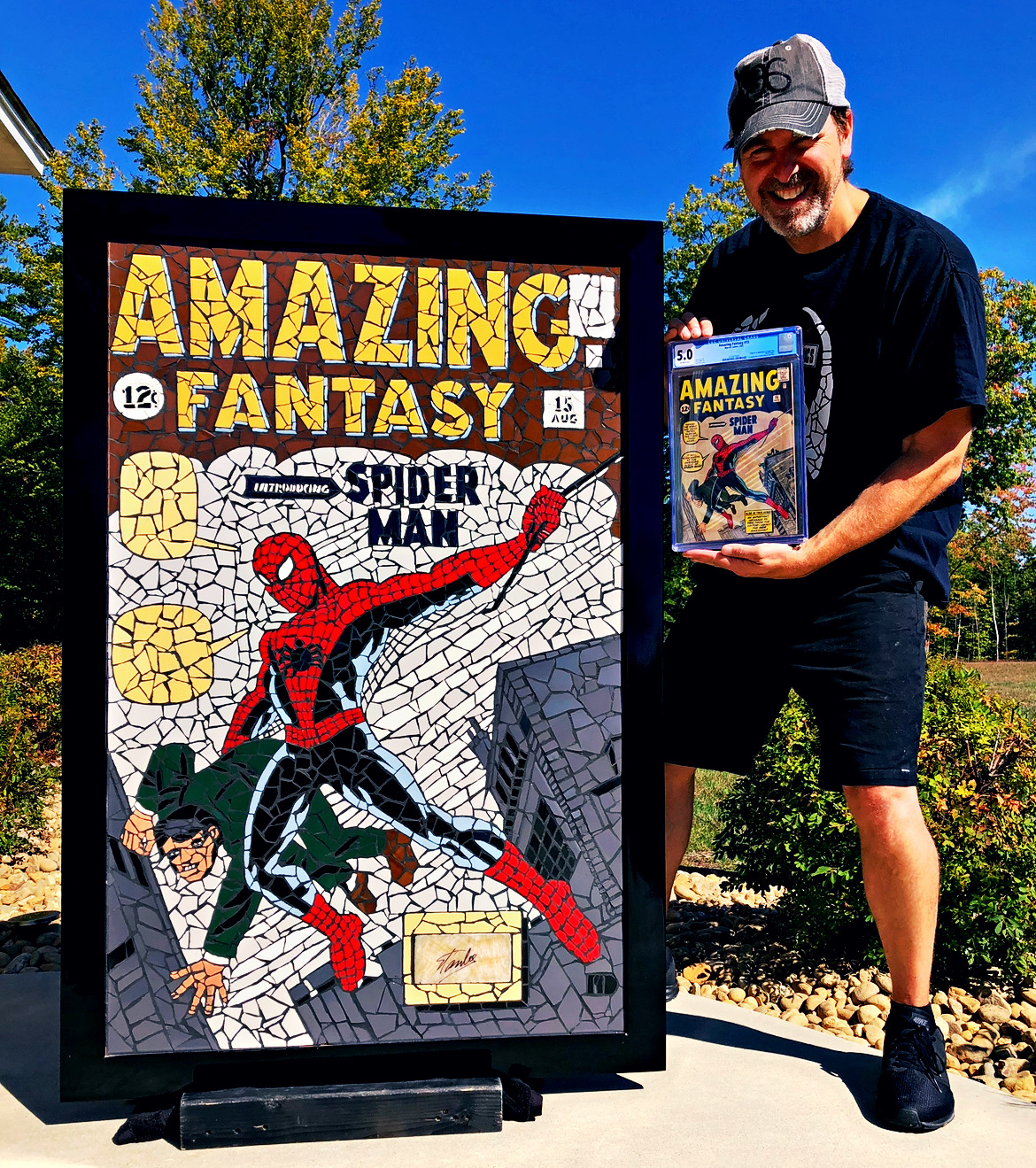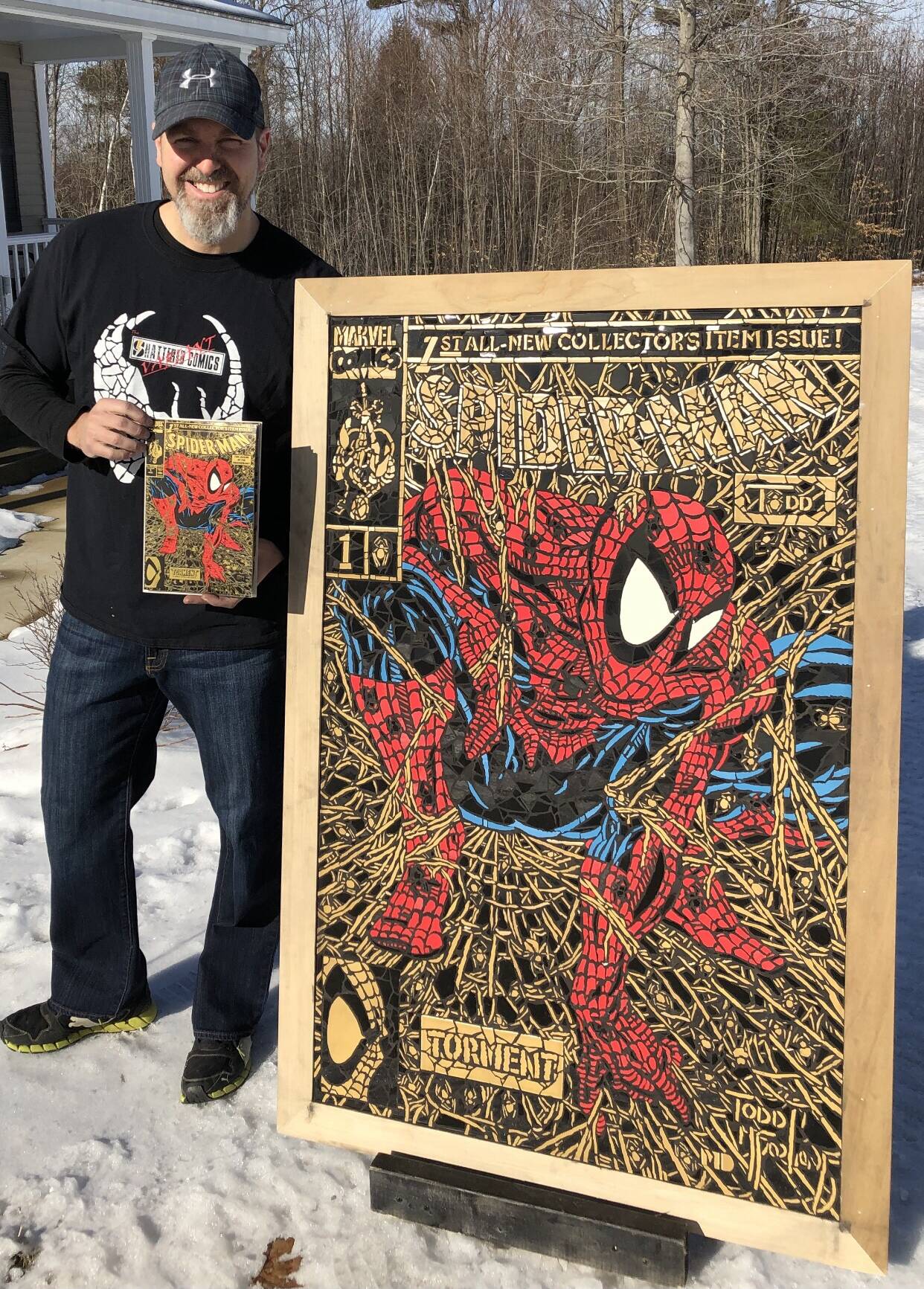 Matt DiMasi shows off his original mosaic alongside the finished product, a variant cover for Spiderman No. 1.