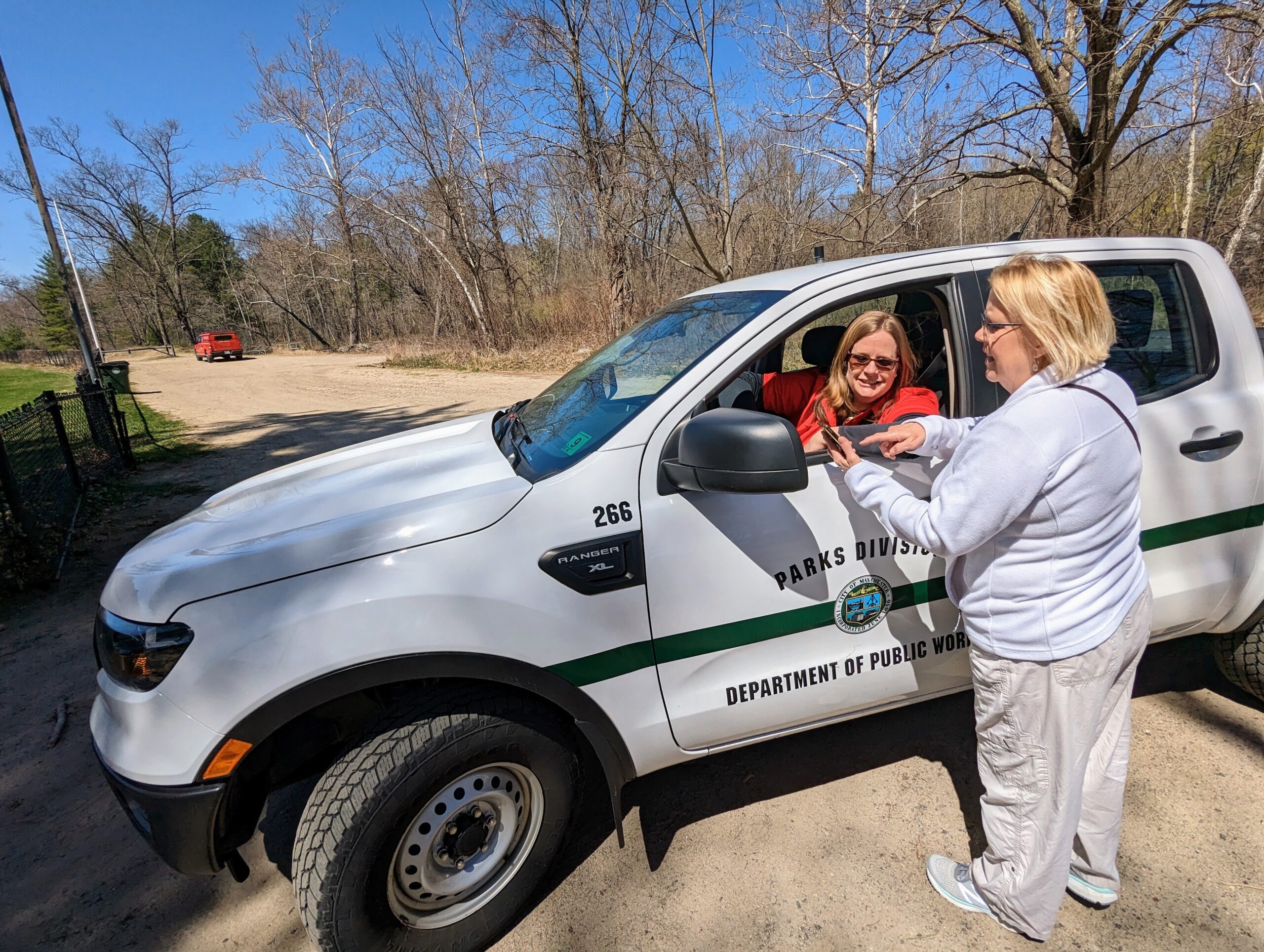 Tammy Simmons Garthwaite, right, confers with Kate Waldo, of the city’s Parks & Recreation Department, in advance of the April 29 clean-up at Piscataquog River Park. Photo/Carol Robidoux