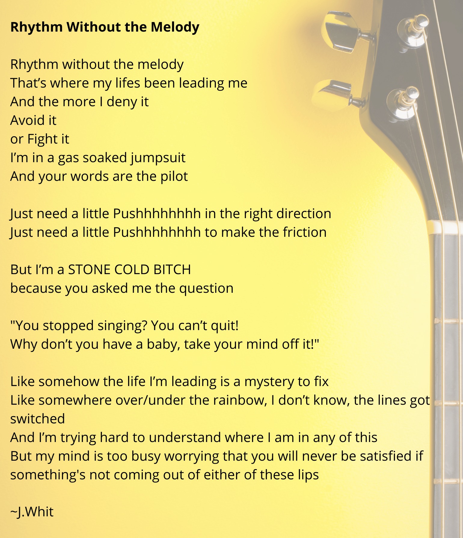 Whit describes herself as: A lover of linguistics, rhymery and unabashedly truth-telling, J. Whit is born to the page. She dabbled in many art forms in her past life, but finds the written and spoken word the most raw and uninhibited. She enjoys solitude, hot nettle tea, soft jazz and believes writing through trauma improves physical and psychological well-being.