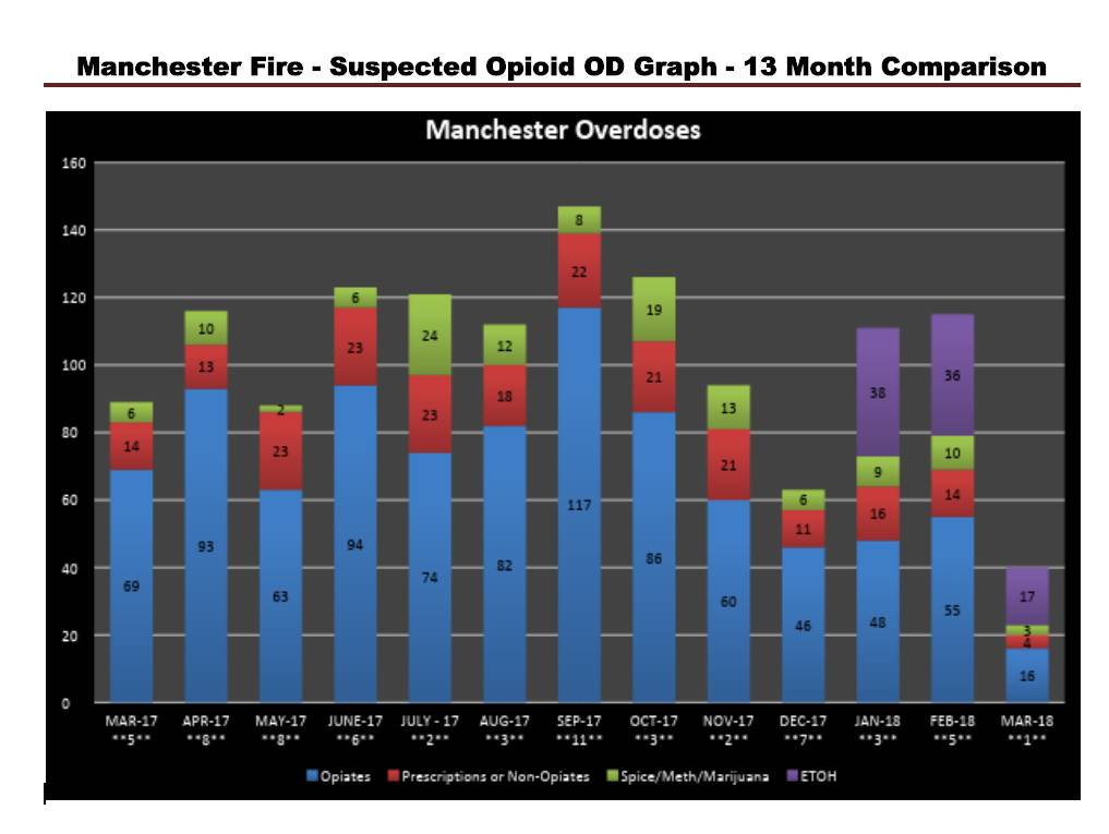 Manchester OD’s are up 23 percent from 2017 at this time, while fatalities are down 27 percent.