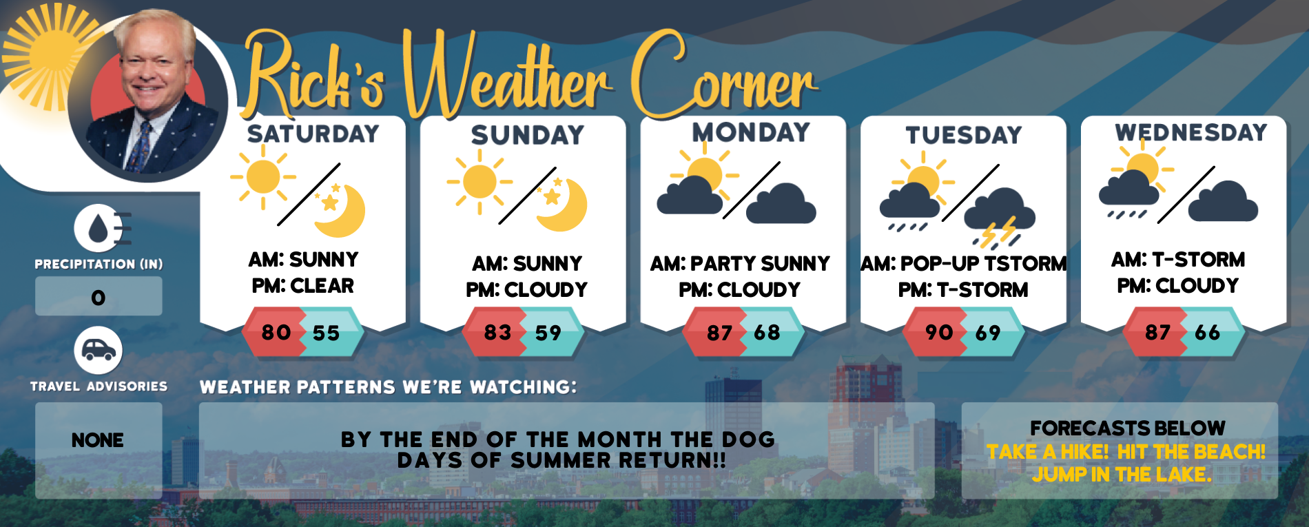 Today high pressure builds in from Canada bringing fair and comfortable weather this weekend with highs around 80.