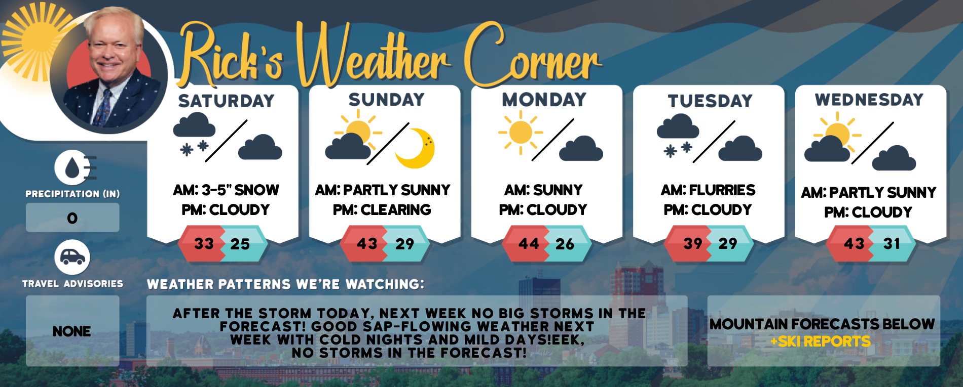 After the storm today, next week no big storms in the forecast! Good sap-flowing weather next week with cold nights and mild days!