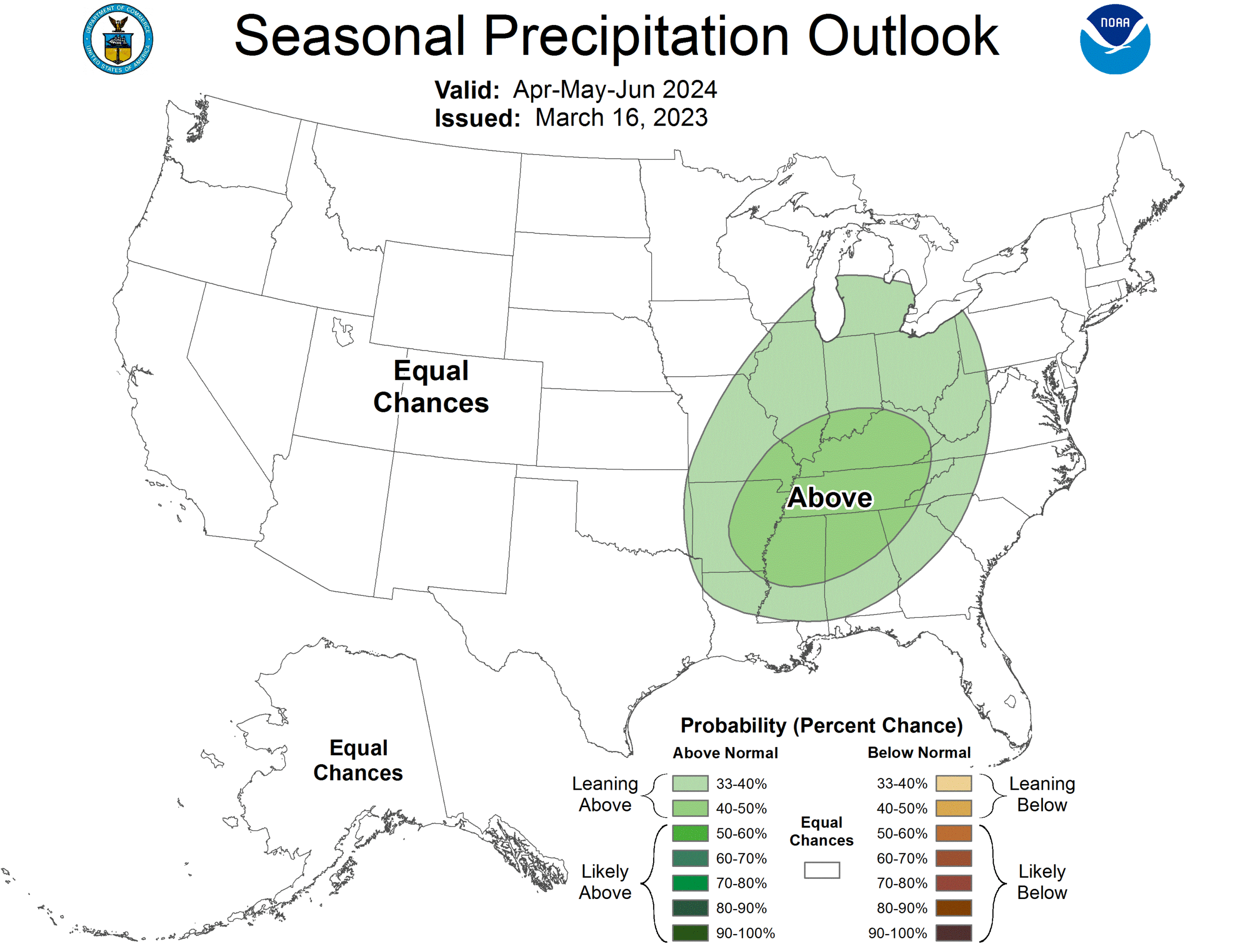 Precipitation outlook for the months of April, May, and June. Equal chances for wetter or drier conditions.