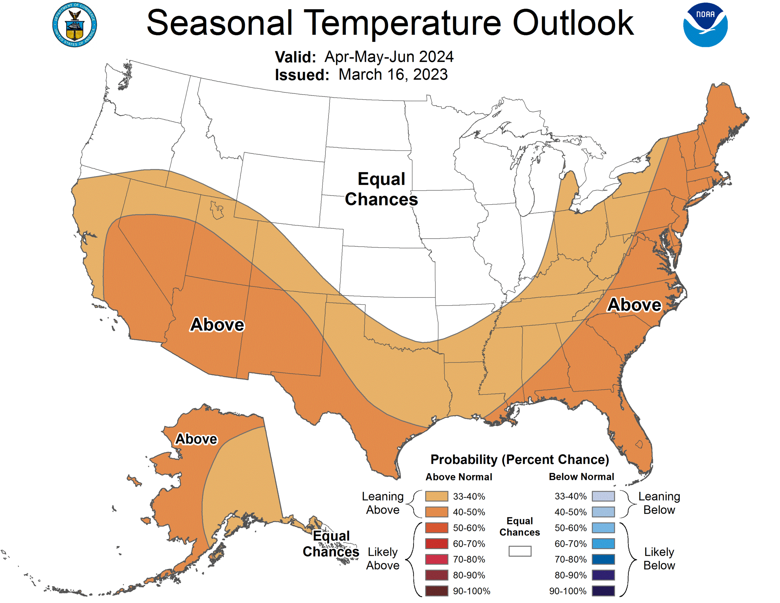 Temperature outlook for the months of April, May, and June. Maybe an early summer as warmer temperatures continue for April, May, and June.