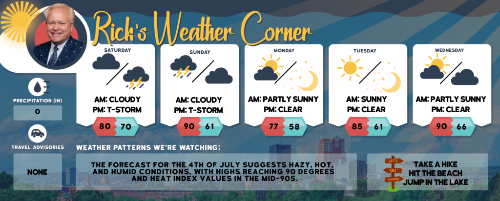 The forecast for the 4th of July suggests hazy, hot, and humid conditions, with highs reaching 90 degrees and heat index values in the mid-90s.