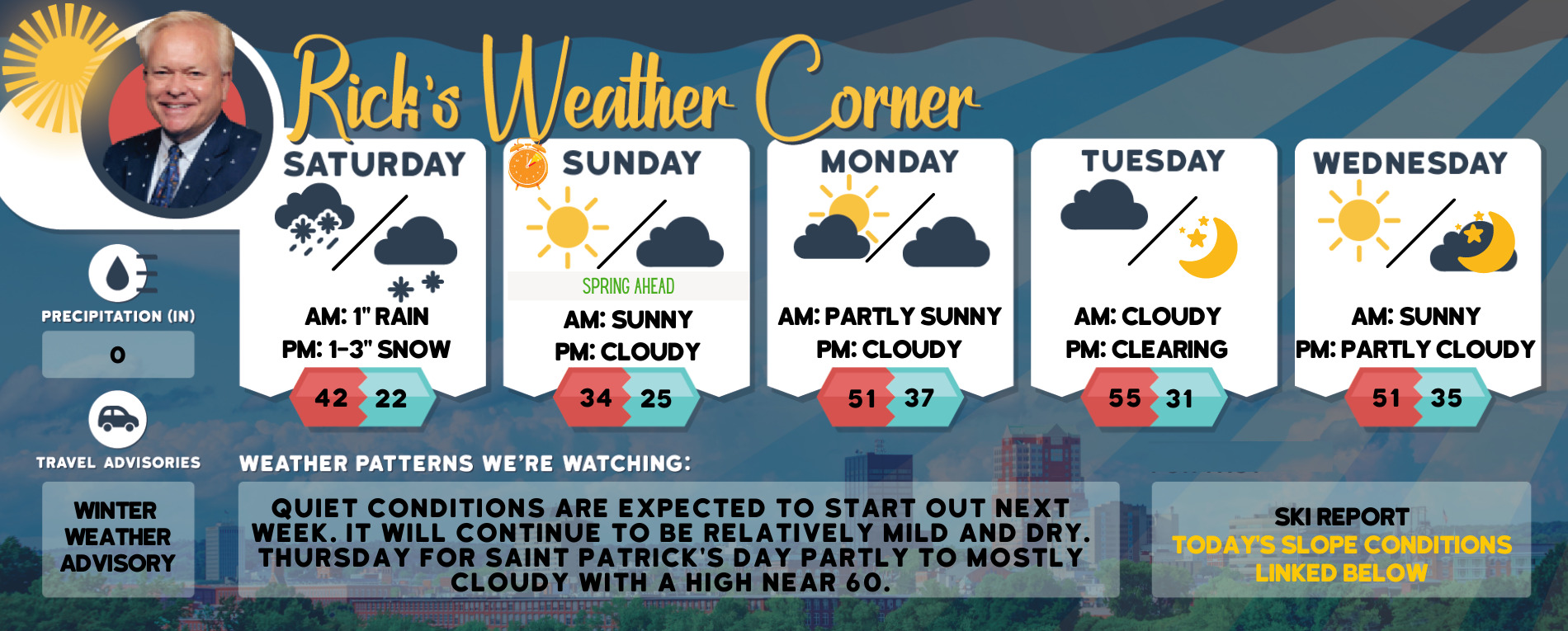 Quiet conditions are expected to start out next week. It will continue to be relatively mild and dry. Thursday for Saint Patrick’s Day partly to mostly cloudy with a high near 60.