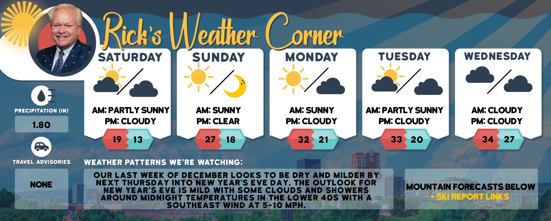 Our last week of December looks to be dry and milder by next Thursday into New Yearโs Eve Day. The outlook for New Yearโs Eve is mild with some clouds and showers around midnight temperatures in the lower 40s with a southeast wind at 5-10 mph.