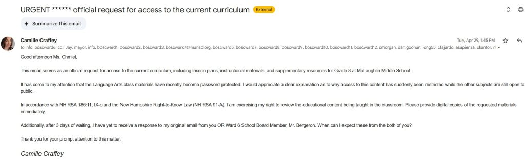 Craffey sent another e-mail to Manchester School District Superintendent Dr. Jenn Chmiel referencing the first e-mail and issuing a right-to-know request regarding details on the worksheet.