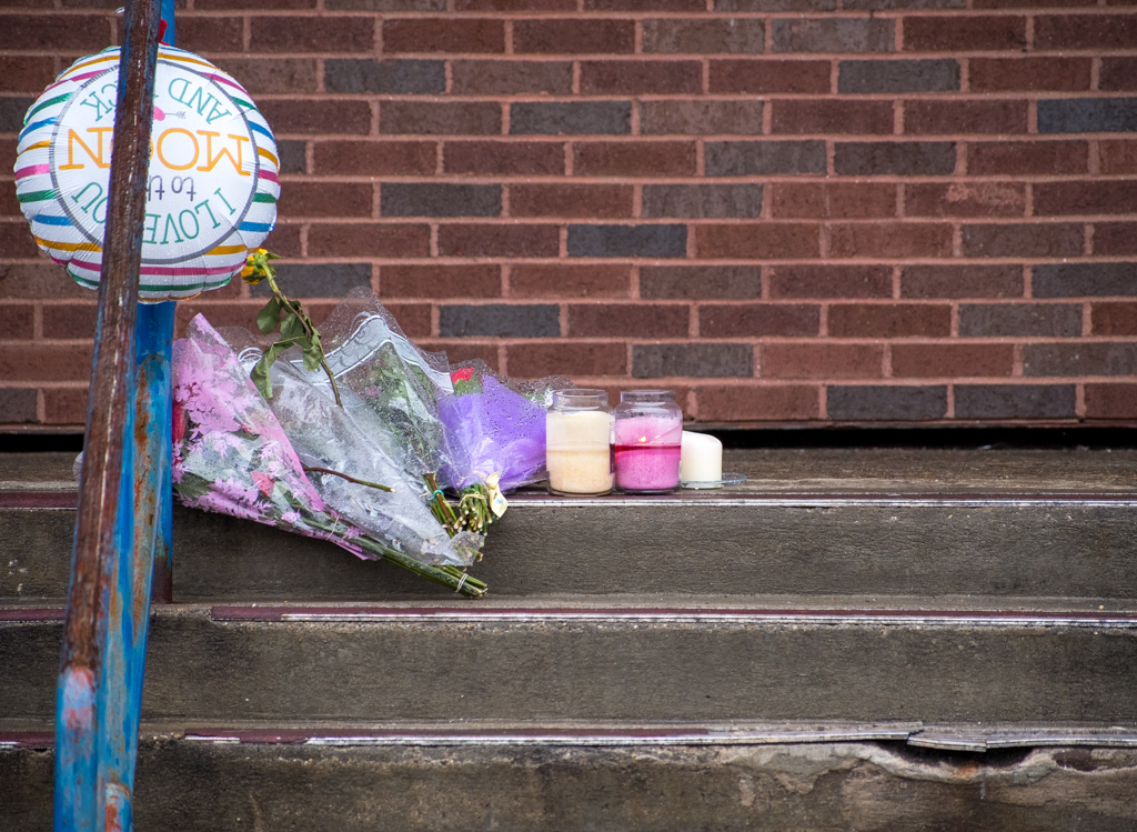 A memorial display of flowers, candles and a balloon was left on the steps outside the temporary shelter near the place where Lascelle’s body was found Saturday.