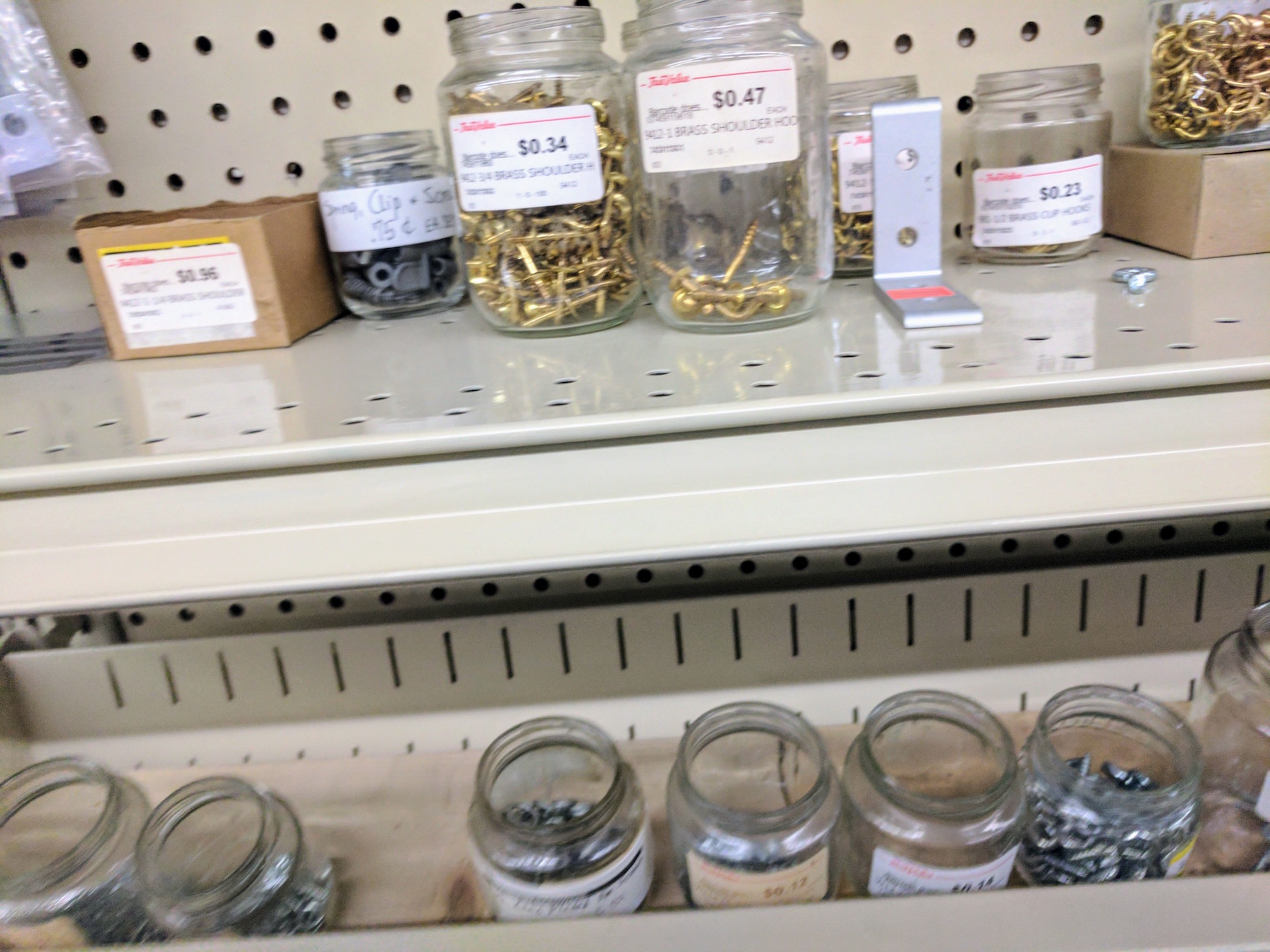I smiled when I got to the screws and nails perched on a shelf in small jars, some of them looked a lot like baby food jars. How quaint, I thought.