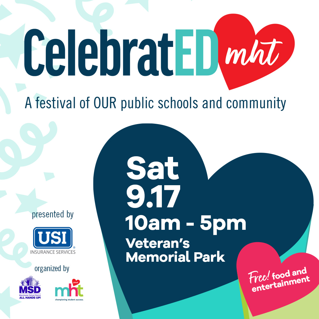 CelebratED MHT! A festival to celebrate public schools and community at Veteran’s Memorial Park on September 17th! Visit: ManchesterProud.org/Celebrated for additional information.