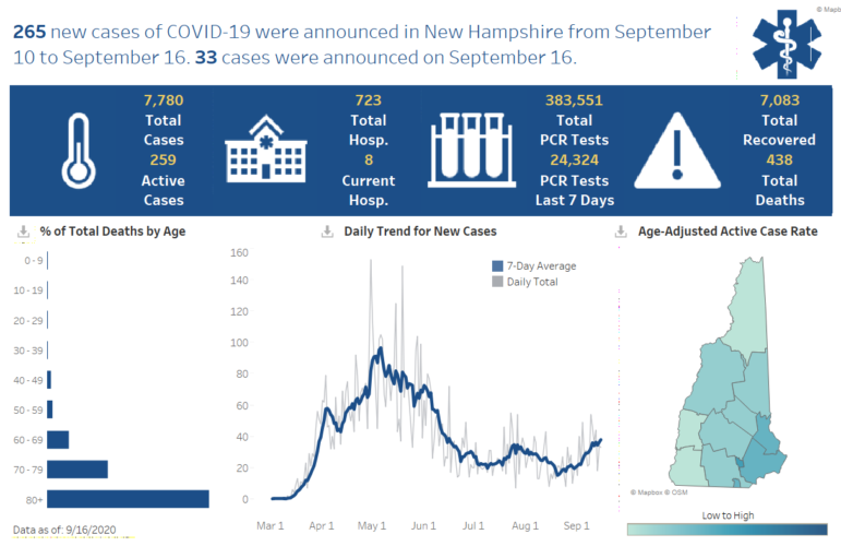 CONCORD, NH โ On Thursday, September 17, 2020, DHHS announced 35 new positive test results for COVID-19. There have now been 7,814 cases of COVID-19 diagnosed in New Hampshire. Several cases are still under investigation. Additional information from ongoing investigations will be incorporated into future COVID-19 updates.