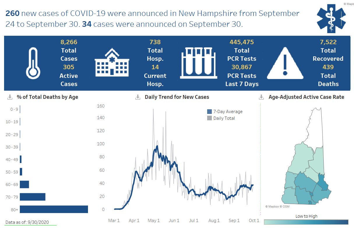 CONCORD, NH โ On Wednesday, September 30, 2020, DHHS announced 34 new positive test results for COVID-19. There have now been 8,266 cases of COVID-19 diagnosed in New Hampshire. Several cases are still under investigation. Additional information from ongoing investigations will be incorporated into future COVID-19 updates.