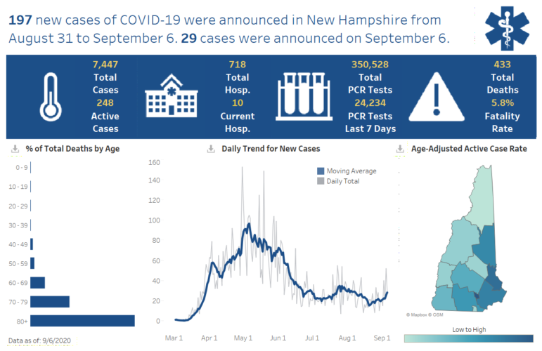 CONCORD, NH โ On Sunday, September 6, 2020, DHHS announced 29 new positive test results for COVID-19. There have now been 7,447 cases of COVID-19 diagnosed in New Hampshire. Several cases are still under investigation. Additional information from ongoing investigations will be incorporated into future COVID-19 updates.