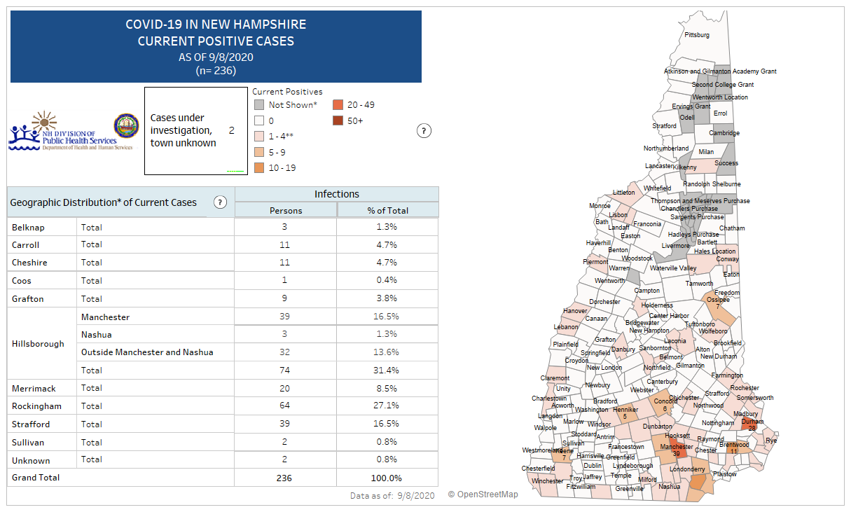 New Hampshire 2019 Novel Coronavirus (COVID-19) Summary Report (data updated September 8, 2020, 9 a.m.)