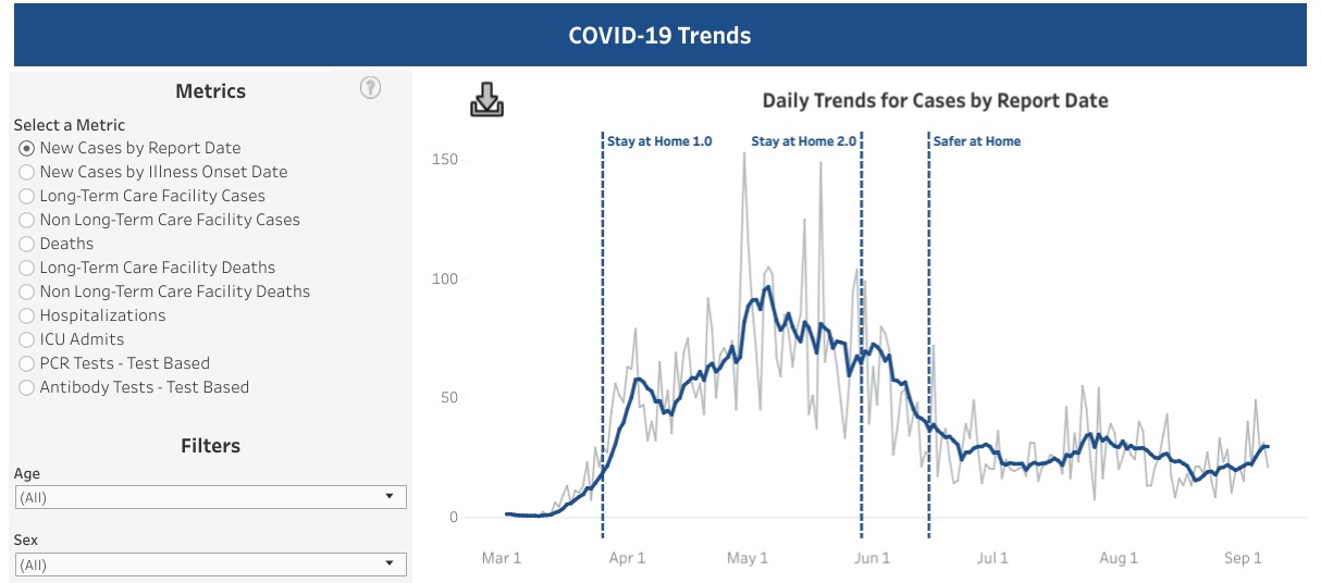 One new hospitalized case was identified for a total of 719 (10 percent) of 7,517 cases. Four of the new cases had no identified risk factors. Community-based transmission continues to occur in the State and has been identified in all counties. Of those with complete risk information, most of the cases have either had close contact with a person with a confirmed COVID-19 diagnosis, are associated with an outbreak setting, or have recently traveled.