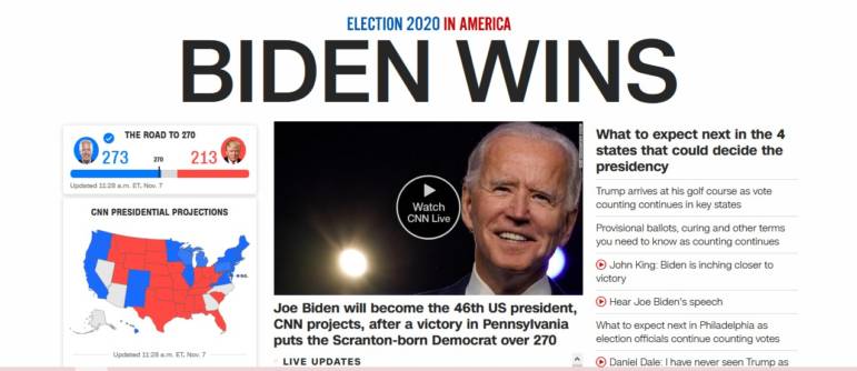 As of approximately 11:30 a.m. on Saturday, CNN, MSNBC, ABC ,ย CBS, and the Washington Post among others have now put Biden’s electoral college count at 273, above the 270 needed to win.