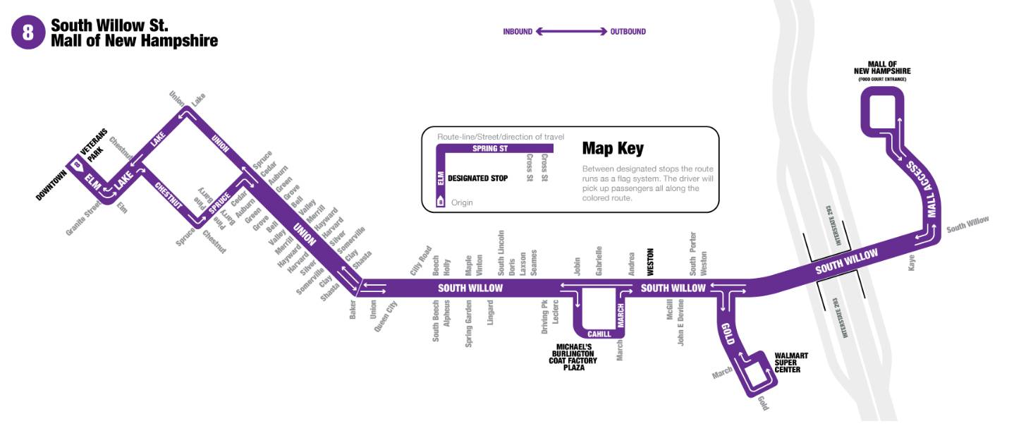 MTA Route 8 makes six regular loop stops — the Downtown Manchester Doubletree Hotel, Michaels/Burlington Coat Factory Plaza on South Willow Street, Walmart on Gold Street, the Mall of New Hampshire, South Willow Street and Weston Road, and Downtown Manchester. For a full list of route stops and times, visitย https://www.mtabus.org/routeschedules/route-map/route-8/.