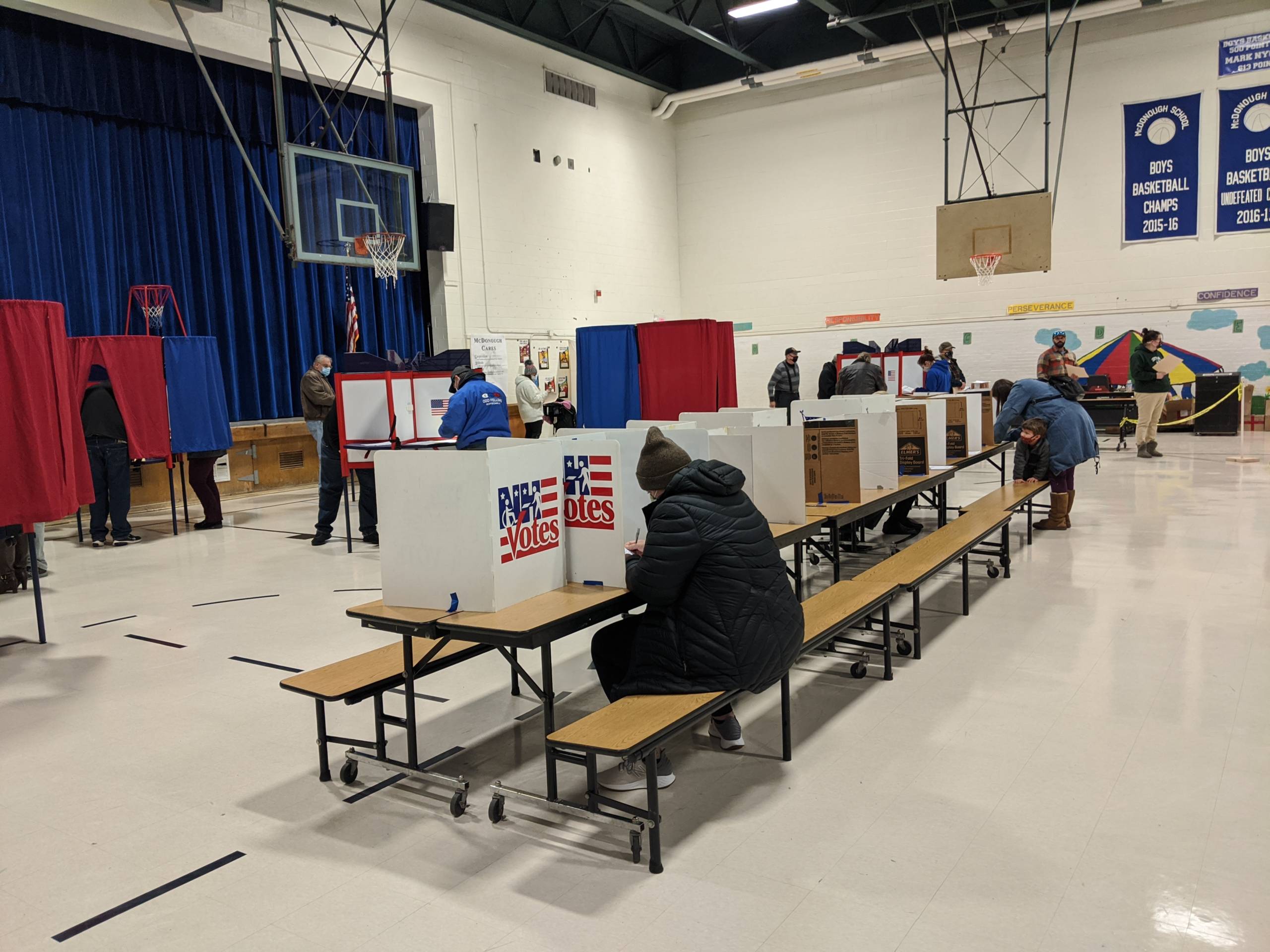 Once inside voters were directed to take a spot on line alphabetically where they could check in and receive a purple ticket, which they then exchanged for two ballots. From there they could find an open spot in one of eight voting kiosks, each able to accommodate four voters at a time, or sit at a long cafeteria table with another dozen spots and privacy barriers.