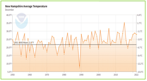 According to data from the National Centers for Environmental Information (NCEI), New Hampshire has had an average temperature of 28.1 degrees Fahrenheit this winter, 6.4 degrees warmer than the state’s average winter temperature since 1901.