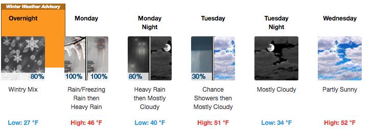 The National Weather Service has issued a winter weather advisory that remains in effect until 8 a.m. on Monday April 16 for Manchester and the surrounding region. Expect to hear the pitter-patter of a rare late-season wintry mix Sunday, propelled by a cold air mass which will keep temperatures below freezing over most areas. Light freezing rain is likely with areas of sleet and some snow as well Sunday.